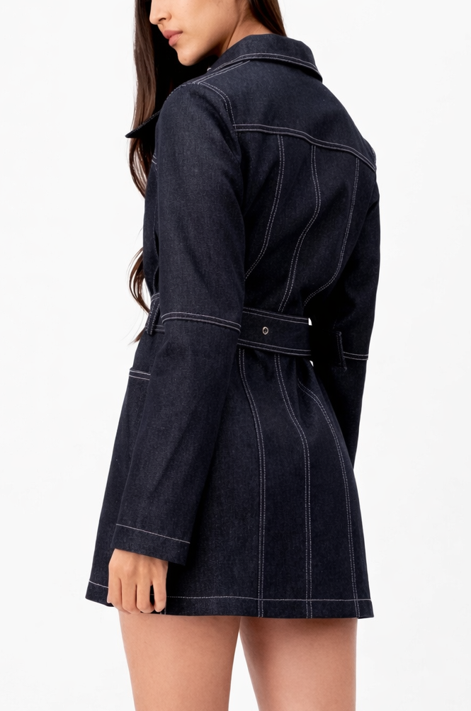 Refresh availabilityA structured take on classic denim. This belted mini dress is crafted from deep indigo denim and elevated with bold contrast stitching for a sharp, tailored finish. Designed with a wide statement collar, long sleeves, and a cinched waist belt featuring a sleek metallic buckle, it creates a flattering, sculpted silhouette. Functional front pockets add a subtle utility edge while maintaining a clean, refined look.