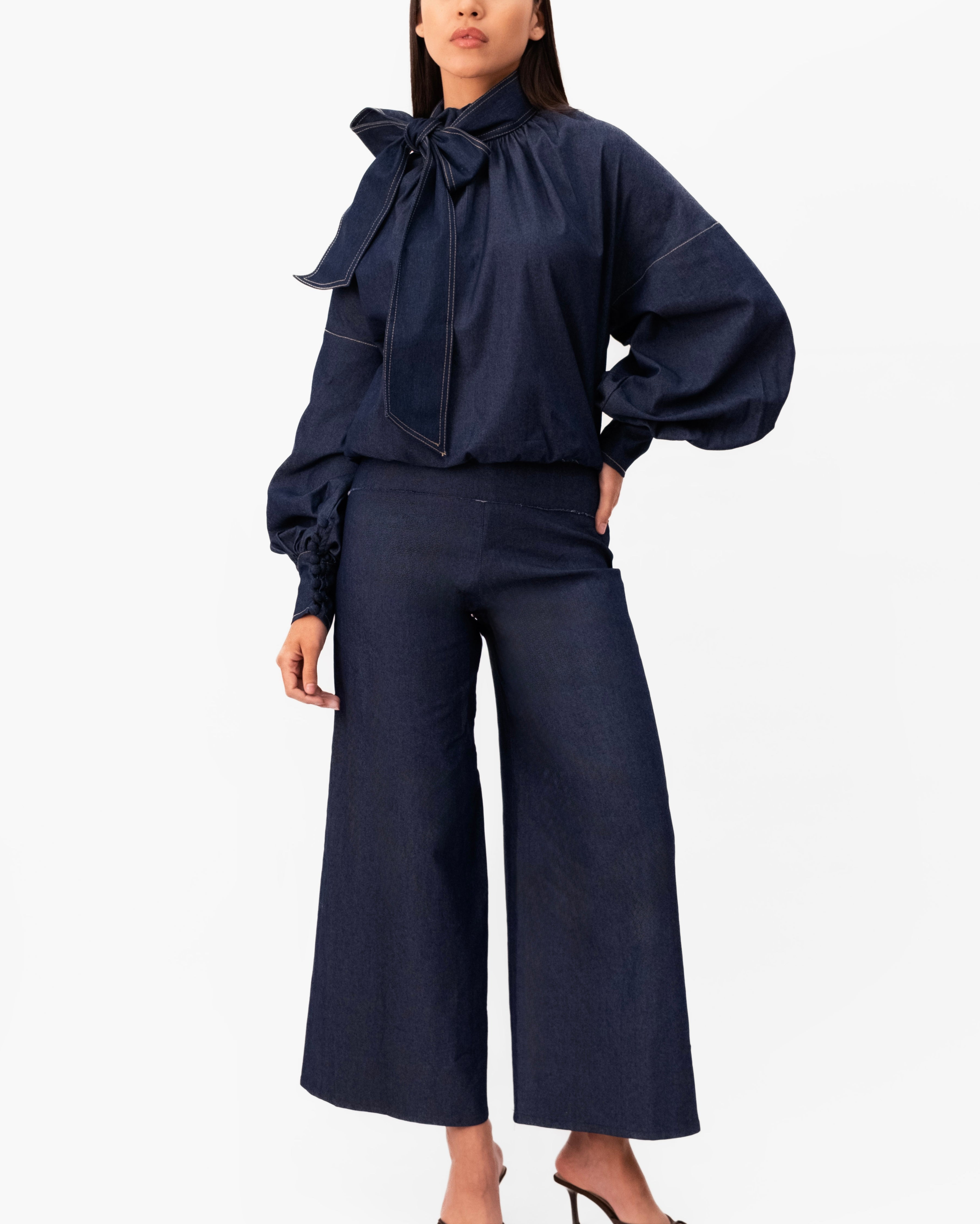 Refresh availabilityTailored for effortless sophistication, these high-waisted wide-leg pants are designed to create a clean, elongated silhouette. Crafted from structured light denim, they feature a relaxed wide-leg cut that drapes elegantly while maintaining a sharp, polished look. The minimal design allows them to be styled easily for both casual and elevated outfits, making them a versatile wardrobe essential. Comfortable, modern, and timeless, these pants pair perfectly with both tailored tops and relaxed blouses.