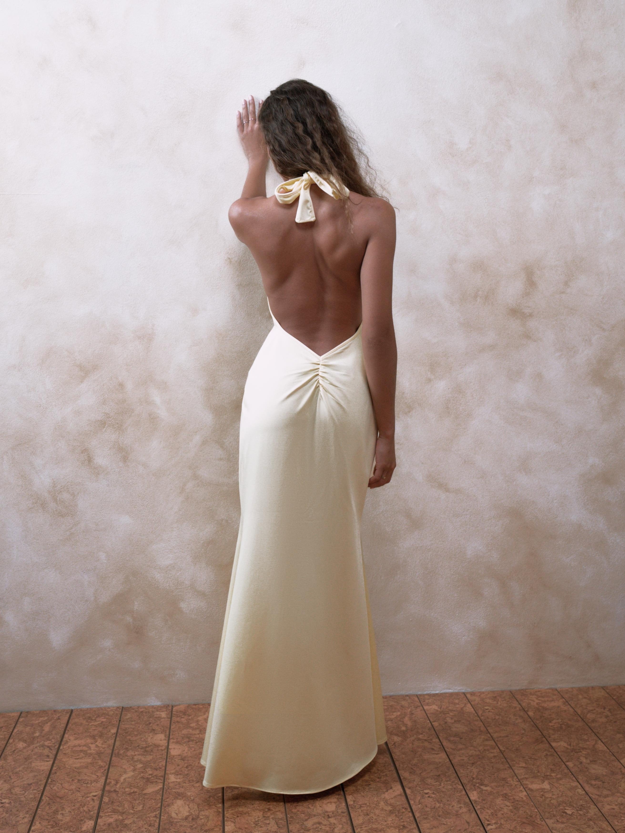 Refresh availabilityThe Isla dress in yellow channels a calm yet captivating energy. Crafted from soft, breathable fabric in a pastel yellow tone, this halter-style gown elongates the silhouette with a subtle flare at the hem. Elegant yet easy — perfect for sunset dinners or summer events.